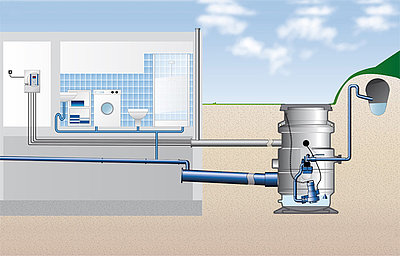 Als Abwasserpumpstation mit einer oder zwei Tauchmotorpumpen außerhalb des Gebäudes.